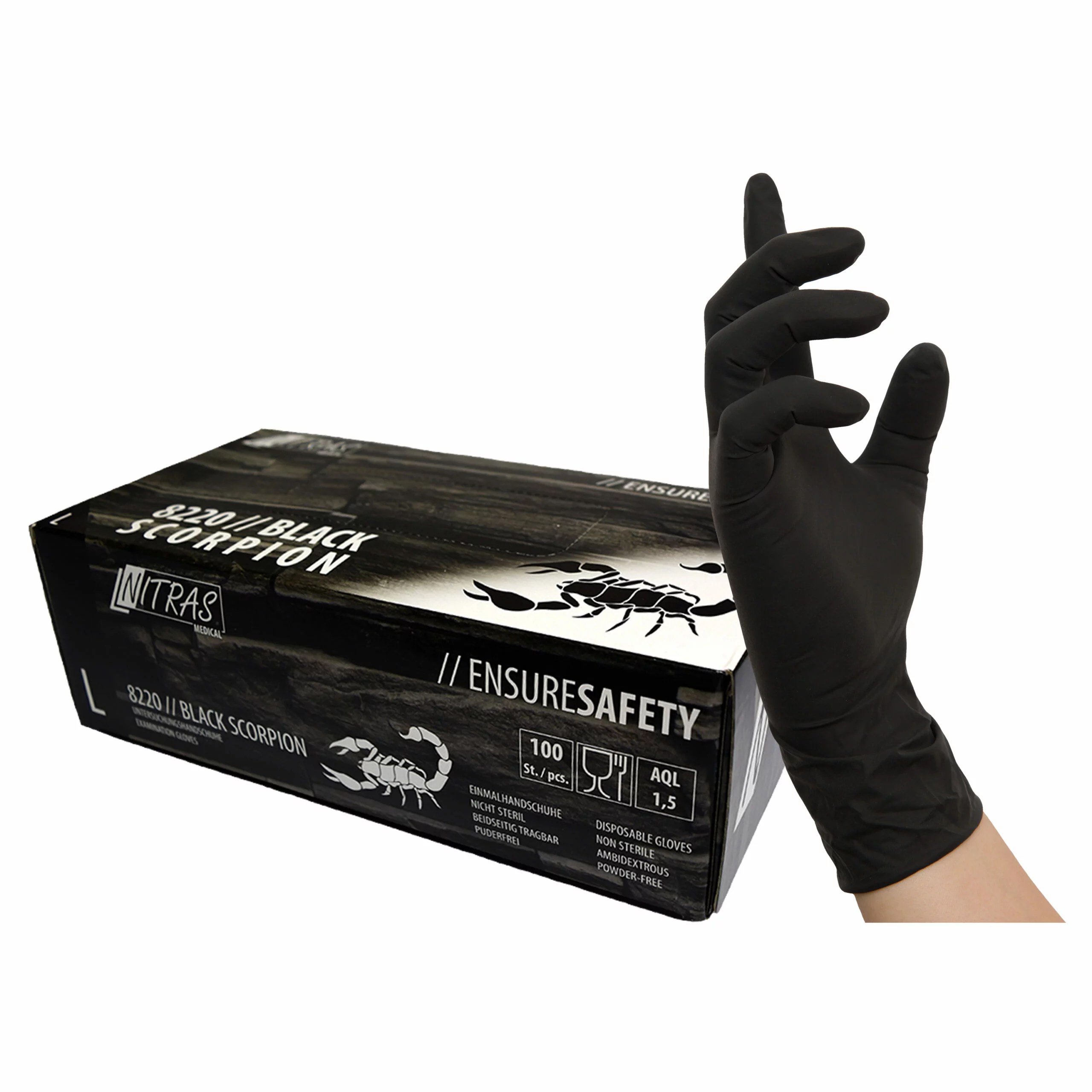 Produktbeschreibung: NITRAS BLACK SCORPION Latex-Einmalhandschuhe